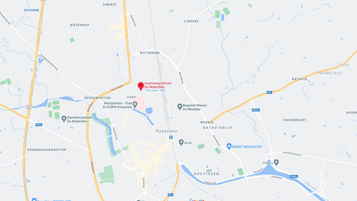 Je vindt ons in het centrum van Roeselare, naast het AZ Delta ziekenhuis, campus Brugsesteenweg. De Waterdam ligt op wandelafstand van het station en er is een parking aan het woonzorgcentrum zelf.